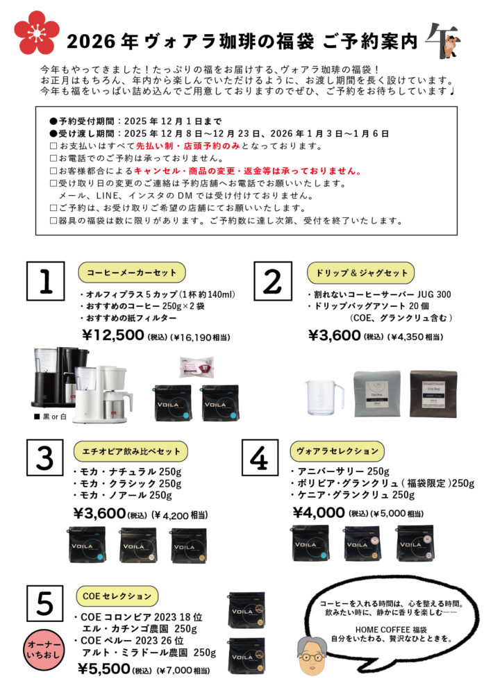 NEWSreleaseお知らせ NEWS ヴォアラ珈琲福袋2026(店頭販売分) NEWS 2025.10.24 up Tweet CATEGORY ワークショップ・イベント 取扱い商品 店舗からのお知らせ 全店 霧島国分本店 天文館店 ドルフィンポート店 谷山店 採用情報 PREV BACK